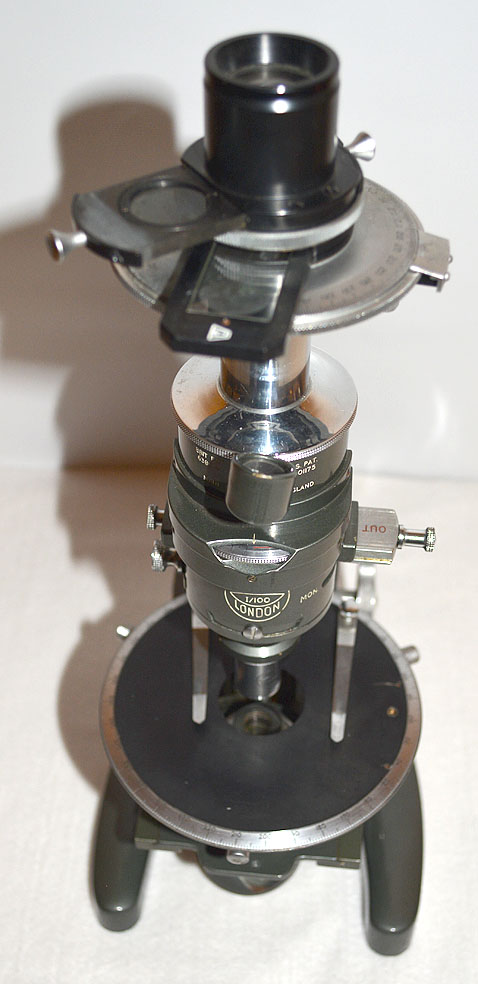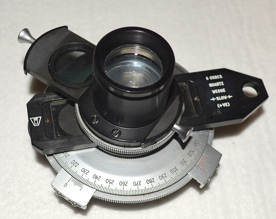 with a quarter waveplate, a rotating polarising disc graduated 0 –