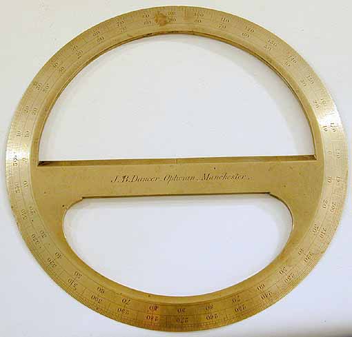 large antique circular PROTRACTOR engraved in script on the cross bar J.B.Dancer, Optician, Manchester . This 7-inch