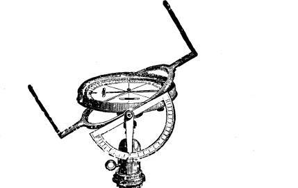 To use this instrument for measuring vertical angles, the whole dial was turned sideways, by means of a ball‑and‑socket joint, the collar of which was slotted to allow of this being done. A plumb‑bob was then suspended from the stud, and as the dial was moved in a vertical plane the string of the plumb‑bob indicated the angle of elevation or depression.