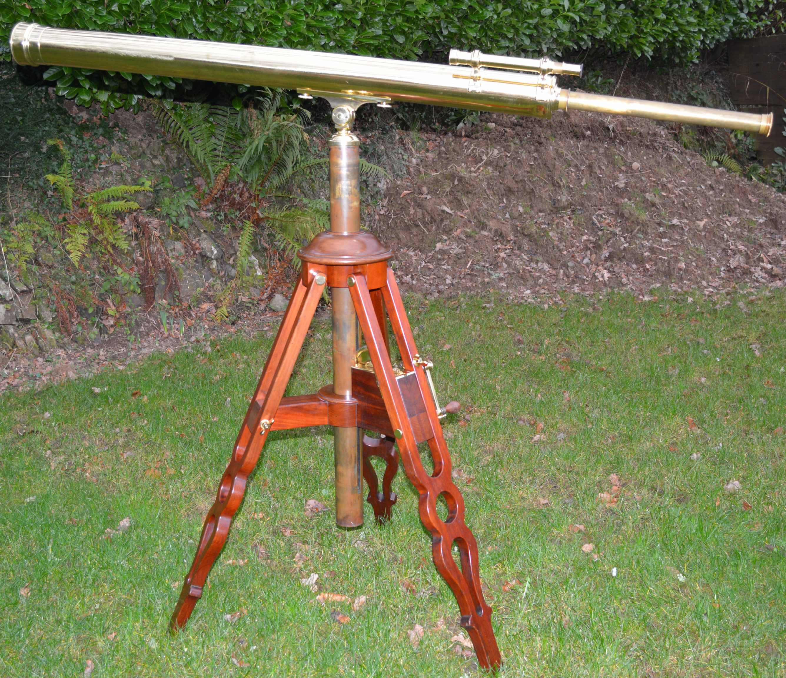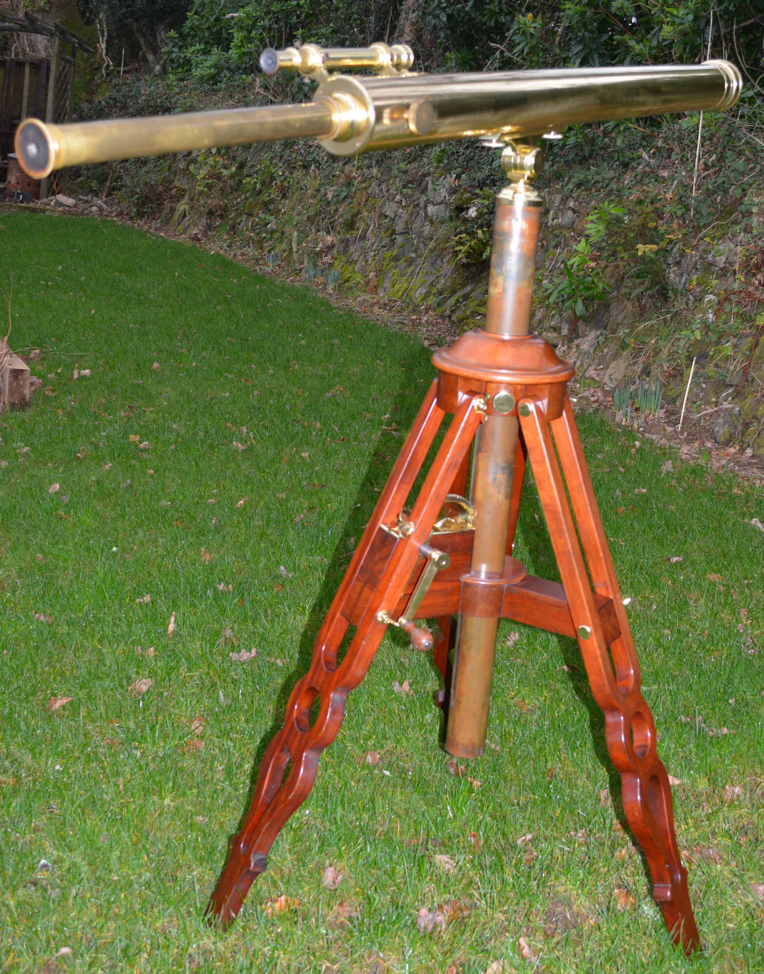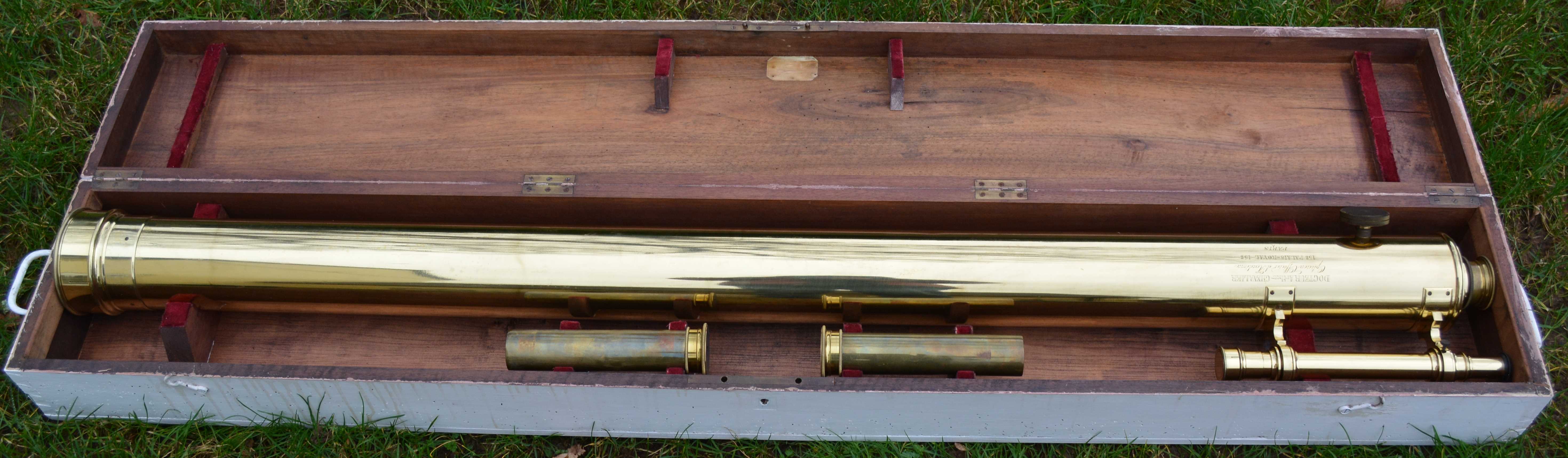 This telescope, I believe, was made by John Browning of London, retailed by Dr. Arthur Chevalier of Paris and presented to George Cecil Ives (friend of Oscar Wilde) for his 12th Christmas. The main lens endcap is engraved “George Cecil Ives, November 1879” (George was born Oct. 1867). The side of the main tube is engraved “DOCTEUR Arthur CHAVALIER, Opticien Officer d Acudinire, 158 PALAIS – ROYAL 158, PARIS” and there is a fine hand engraved “J B November 1879” inside the main body tube. The telescope has a small focussing spotting 'scope attached, 3 interchangeable eyepieces – one low power terrestrial erecting lens and 2 high power inverting astronomical lenses and comes in a fitted transit case with carrying handles each end. The stand is a fine mahogany tripod with geared winding handle to adjust the height of the instrument, for sitting or stand and to accommodate all sizes from small children to full grown adults.