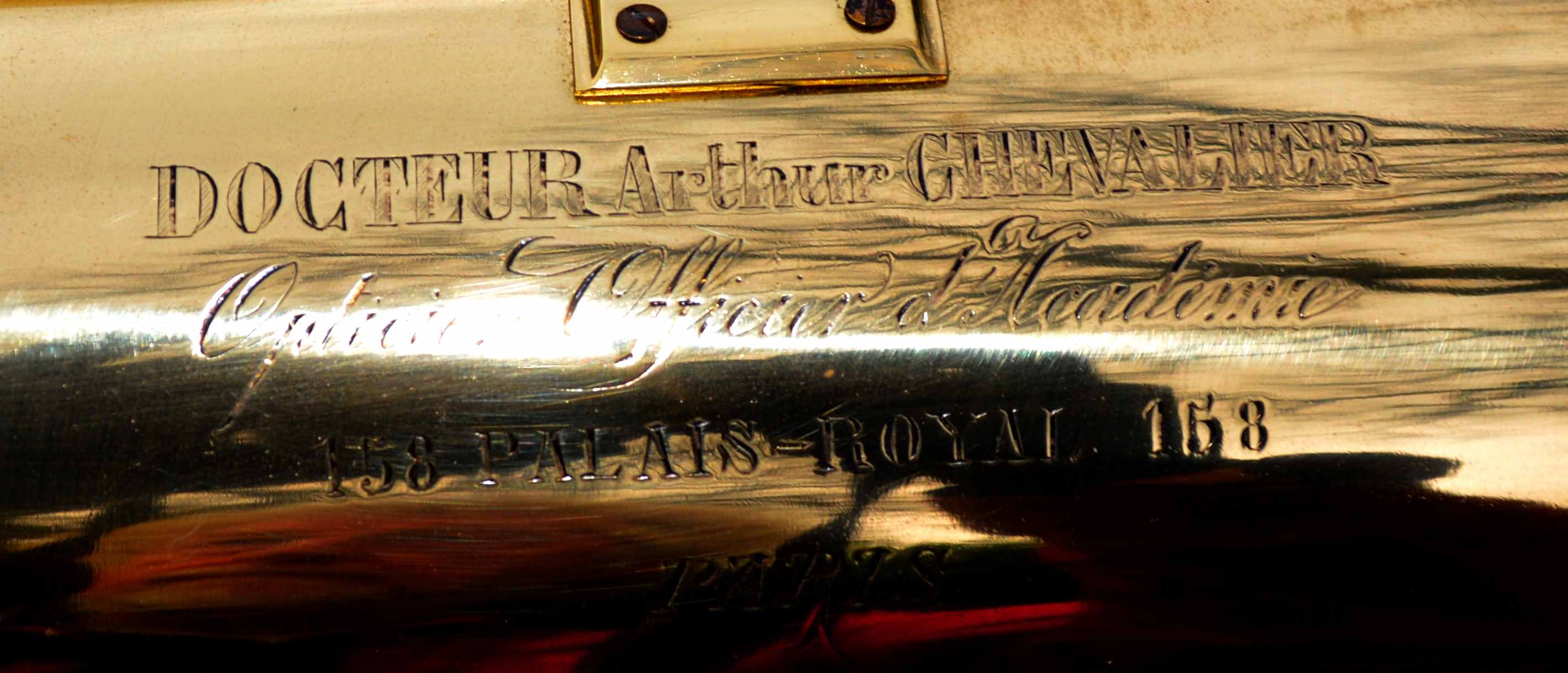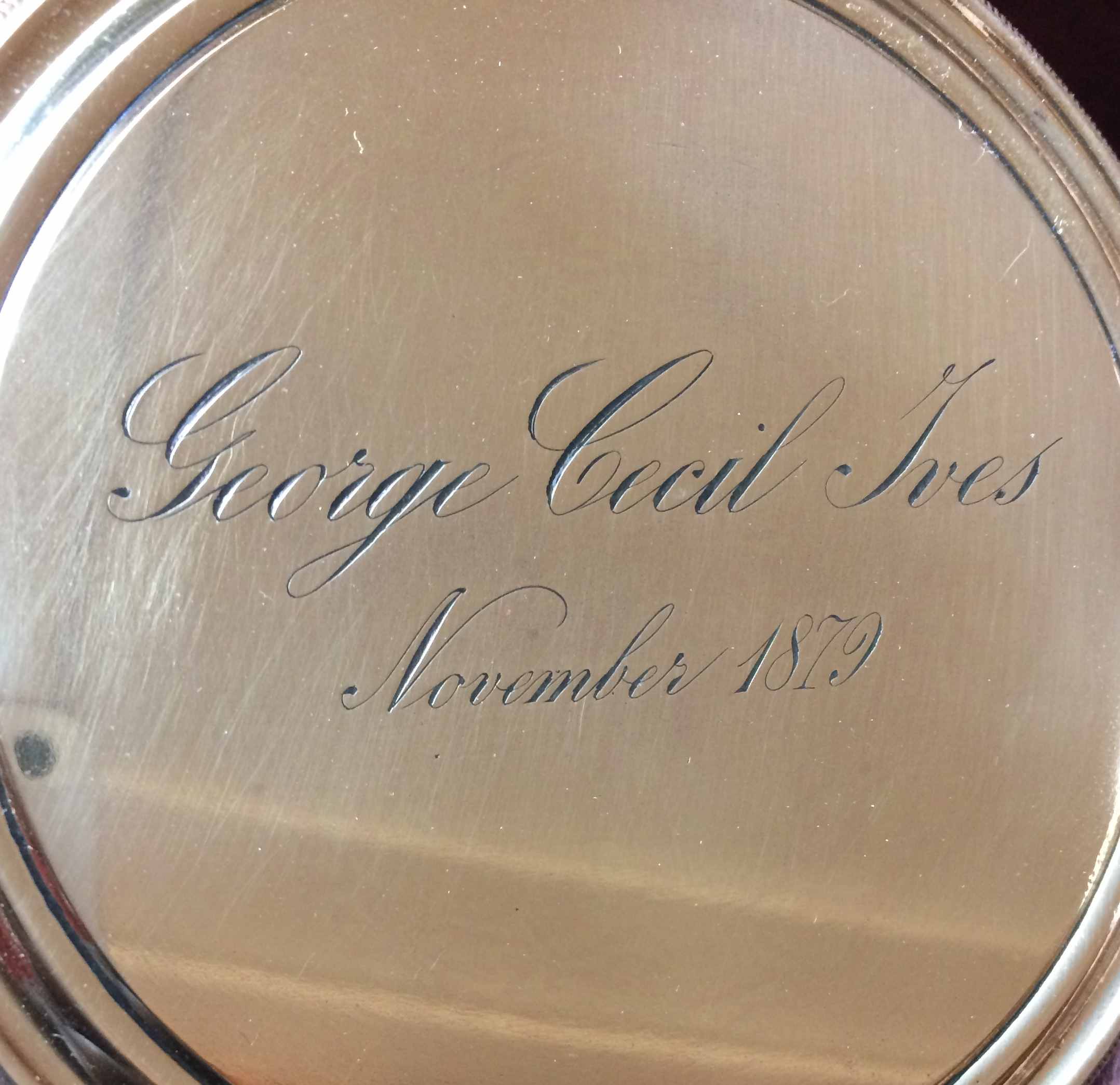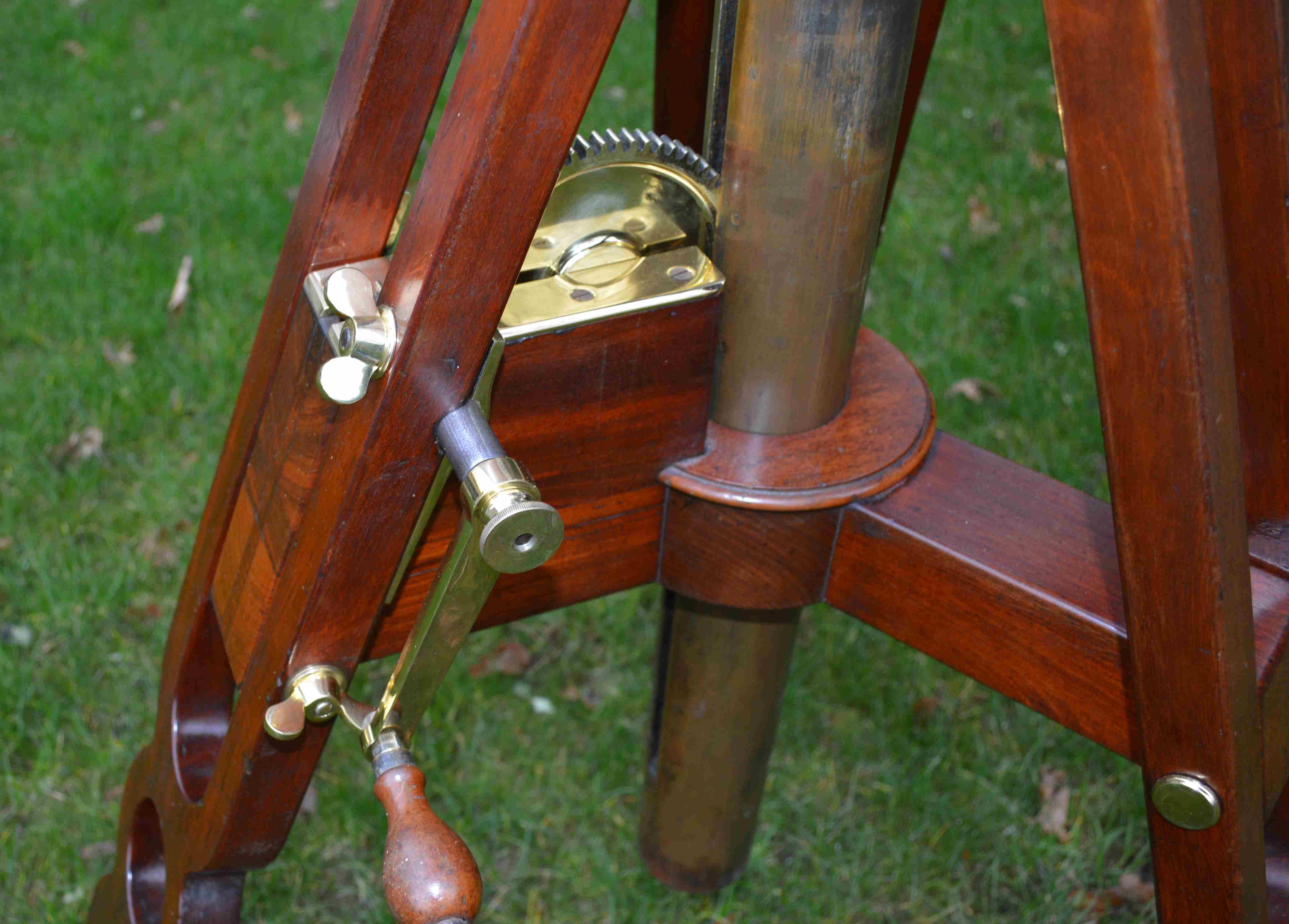 This telescope, I believe, was made by John Browning of London, retailed by Dr. Arthur Chevalier of Paris and presented to George Cecil Ives (friend of Oscar Wilde) for his 12th Christmas. The main lens endcap is engraved “George Cecil Ives, November 1879” (George was born Oct. 1867). The side of the main tube is engraved “DOCTEUR Arthur CHAVALIER, Opticien Officer d Acudinire, 158 PALAIS – ROYAL 158, PARIS” and there is a fine hand engraved “J B November 1879” inside the main body tube. The telescope has a small focussing spotting 'scope attached, 3 interchangeable eyepieces – one low power terrestrial erecting lens and 2 high power inverting astronomical lenses and comes in a fitted transit case with carrying handles each end. The stand is a fine mahogany tripod with geared winding handle to adjust the height of the instrument, for sitting or stand and to accommodate all sizes from small children to full grown adults.